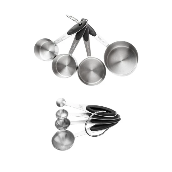 The Fusion Stainless Steel measuring cups and spoons are ideal for all measuring needs when baking or cooking at home. The cups and spoons have a soft grip handle on each with a metal ring to help keep all individual cups/spoons together. The measurements shown on the cups are 1/4 cup (60ml) – 1/3 cup (80ml) – 1/2 cup (125ml) – 1 cup (250ml). The measurements shown on the spoons are 1 tbsp (15ml) – 1 tsp (5ml) – 1/2 tsp (2.5ml) – 1/4 tsp (1.25ml).