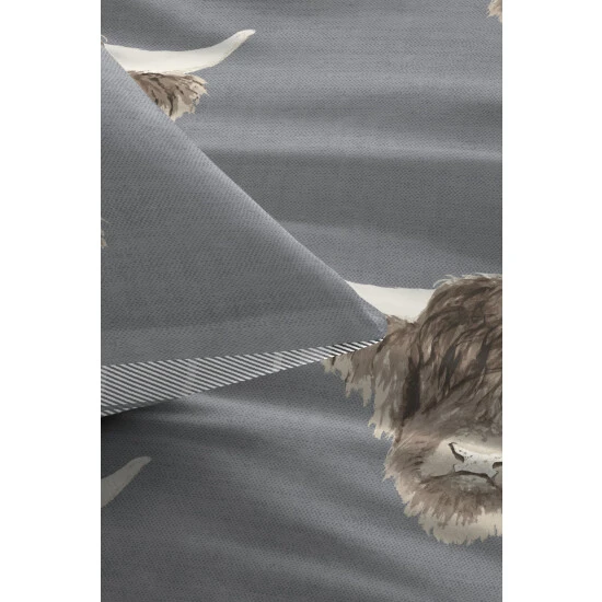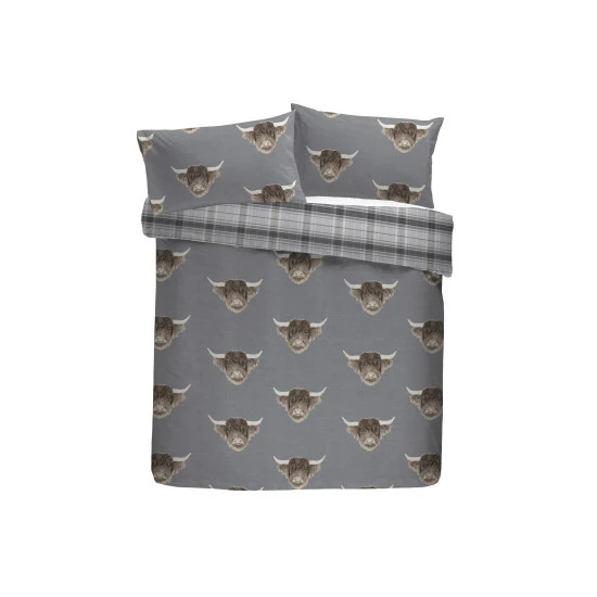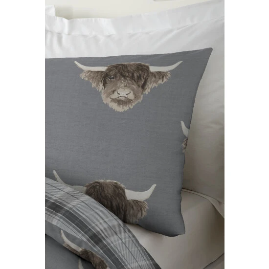 A joyful Scottish inspired bedding set for all you cow fans that's printed on easy care, light grey, polycotton fabric. The reverse of the duvet is complemented with a highland tartan for a fun Celtic feel.