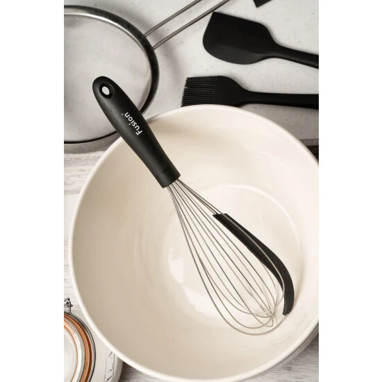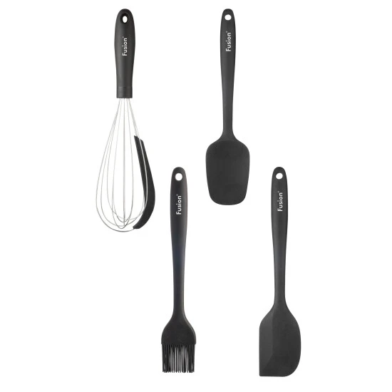 The Fusion multi-purpose silicone range of tools and whisk, are perfect for a variety of tasks around the home when cooking and baking. The silicone range has a soft touch which provides and comfortable yet firm grip, complete with a hanging hole in the handle. The Set comprises of a silicone spatula, spoon and pastry brush with a stainless steel whisk, complete with integrated silicone bowl scraper.. Complete with a 5 year guarantee, the Fusion Silicone range, is safe for non stick surfaces, is heat resistant up to 180°C and is suitable for dishwasher cleaning for ease and convenience.