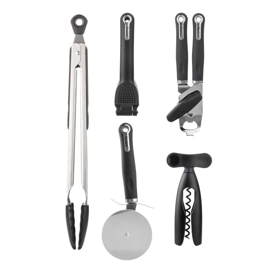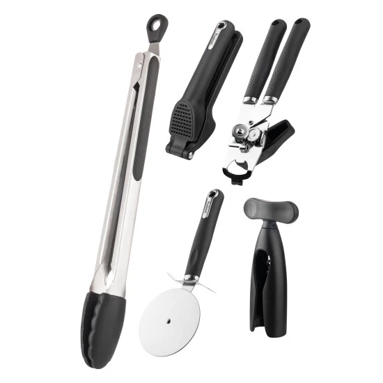 The Fusion range of Gadgets, are perfect for a variety of tasks in the kitchen from opening tins to cutting pizzas. Featuring a soft grip handles for a comfortable yet firm grip. The Set comprises of a Can Opener, Garlic Press, Pizza Cutter, Corkscrew and Stainless Steel tongs. the can opener comes complete with an integrated bottle opener, while the garlic press has a 360 handle to clean off any excess garlic. Complete with a 5 year guarantee, the Fusion range of gadgets are dishwasher safe.