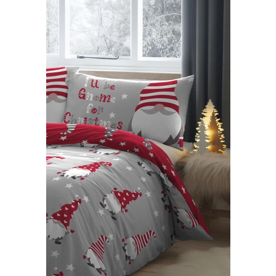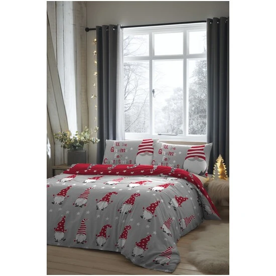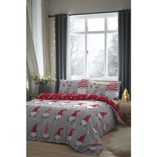 Cute, cheeky gnomes dance across this bedding set to add a touch of festive fun to your bedroom. A stunning red version features printed jolly Christmas characters on the reverse of the bedding for two looks in one. Created using a soft 100% cotton, It's perfect to keep you warm and cosy on the cooler nights.